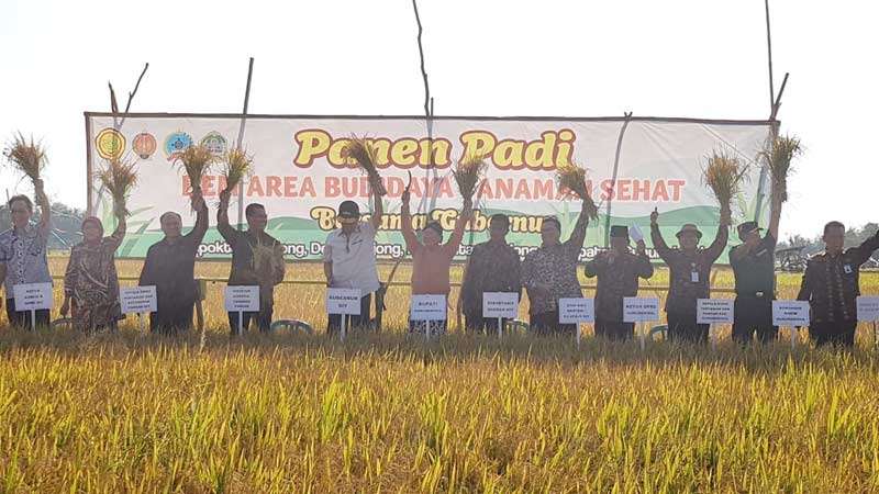 PONJONG, (KH),– Panen Raya Padi Budidaya Tanaman Sehat (BTS) bersama Gubernur DIY, Sri Sultan Hamengkubuwono X di Kecamatan Ponjong, Kabupaten Gunungkidul, digelar Kamis, (5/8/2019).
